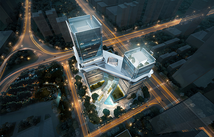 ? ? 雙子塔樓:塔樓整體采用修長的建筑線條勾勒形體,采用幾何分段式強調建筑垂拔高聳的公建姿態(tài);轉角部采用內凹收分,摹畫建筑修長體型;頂部采用舒展的切面開合,塑造建筑挺拔上升質感;材質上采用不同通透率的玻璃幕墻強調建筑體量美感。