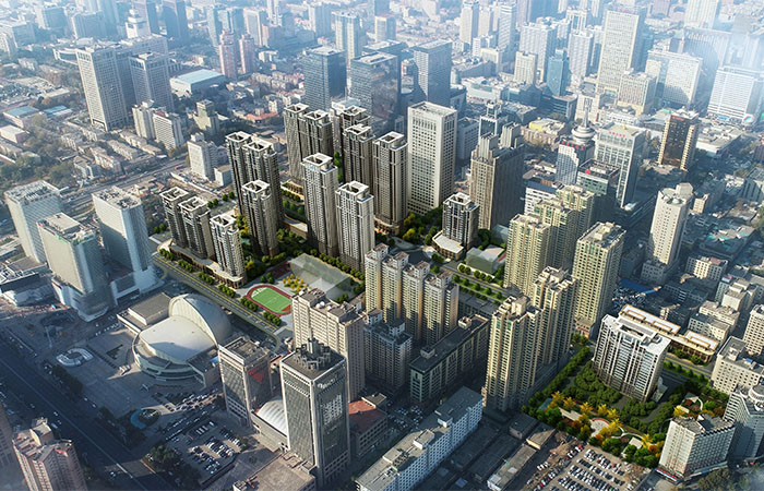 規(guī)劃結(jié)合項目用地情況,分為BDEFH五個地塊,通過點板結(jié)合的多層次圍合式布局方式,打造疏密得當(dāng)、主次分明的規(guī)劃和景觀結(jié)構(gòu)體系;通過建筑群體高低錯落的布置,打破永安街兩側(cè)全為高層的規(guī)劃布局,局部形成開闊的視線通廊,整個片區(qū)高區(qū)低區(qū)交錯,空間疏密有致,避免形成單一的城市規(guī)劃形態(tài),形成總體北高南低,舒朗有度的城市天際線變化;項目通過小學(xué)、幼兒園等配套設(shè)施的合理布局,保障區(qū)域的教育配套設(shè)施;同時,在地塊中心部位結(jié)合綠化景觀打造沿永安街特色商業(yè)步行街,重塑區(qū)域形象,實現(xiàn)對街道的更新與生長。