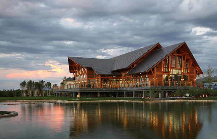 社區(qū)服務(wù)中心采用美式工匠風(fēng)格,具有異域風(fēng)情和文化韻味。松木屋采用輕木結(jié)構(gòu),外墻的墻骨柱內(nèi)側(cè)為石膏板,外側(cè)為定向刨花板(OSB板),產(chǎn)自加拿大地區(qū)的紅雪松木望板等裝飾材料,墻骨柱之間填充不燃保溫材料。適當(dāng)?shù)脑O(shè)計(jì)、材料的選擇、施工和維護(hù)將會(huì)確保木材不會(huì)由于受潮而腐爛發(fā)霉,有效的防止水汽在圍護(hù)結(jié)構(gòu)內(nèi)部凝結(jié),并能夠?qū)⒊睔馀懦?。與傳統(tǒng)的鋼筋混凝土、水泥等建筑材料相比,木材是一種更低碳更環(huán)保的材料,同時(shí)具備改善聲學(xué)與熱性能的特質(zhì),可以為人們提供更舒適健康的室內(nèi)環(huán)境,保證優(yōu)良的室內(nèi)空氣質(zhì)量和營(yíng)造一個(gè)溫暖緩釋壓力的氛圍。