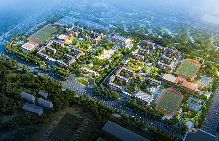 本項目規(guī)劃了36班小學一所、36班初中一所、60班高中一所。小學設置于場地西北側,初中設置于場地西南側,高中設置于場地東側,各組團分區(qū)明確,有機聯(lián)系。每個組團內(nèi)教學樓、宿舍樓獨立設置,按要求配建獨立的體育館、食堂,以及圖書、行政辦公等建筑,同時采用風雨連廊進行串聯(lián),便于師生使用。同時,為提升區(qū)域城市形象,在場地西北角設置一座鐘樓,北側中央位置設置一座儀式感大門。