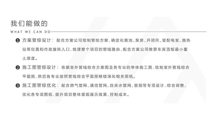 方案管綜設(shè)計:配合方案公司繪制管綜方案,確定化糞池、泵房、開閉所、變配電室、換熱站等位置和市政接排入口,梳理整個項目的管線路由,配合方案公司推算車庫頂板最小覆土厚度。