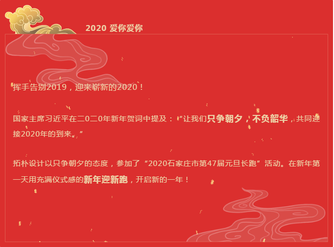 毛總寄語說到:“希望大家在新的一年身體健壯,精力飽滿,健康生活。在奮力工作的同時保證身體健康和生活品質,這是拓樸設計一直以來希望戰(zhàn)友們所追求的,畢竟身體健康才是一切的根本。新年新希望,我們大家一起努力,一起奮斗!”