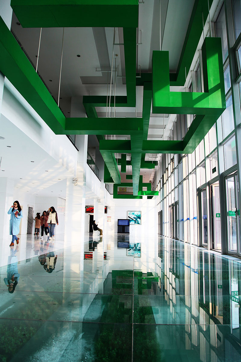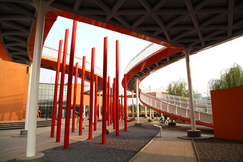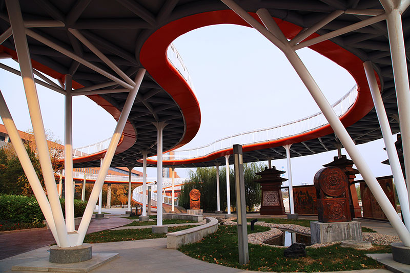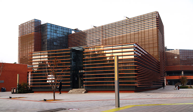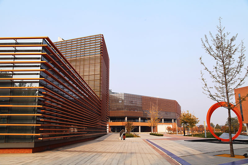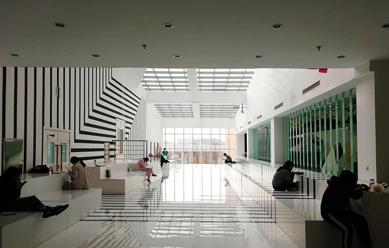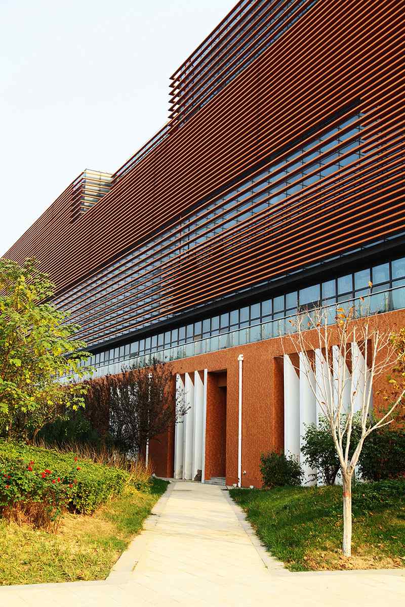 從整體規(guī)劃布局上看,校園內(nèi)各樓排布張弛有度,建筑與景觀相互結(jié)合,中央大湖與景觀廊架搭配蜿蜒蜷曲的步道,平靜中孕育詩(shī)意,給一所沉穩(wěn)的文化建筑帶來靈動(dòng)的韻律之美。