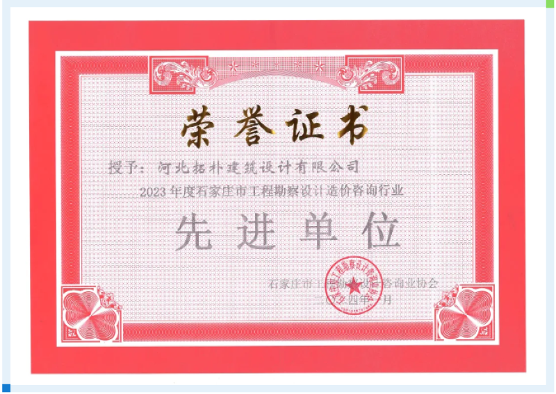 授予河北拓樸建筑設計有限公司2023年石家莊市工程勘察設計造價咨詢行業(yè)"先進單位”獎;授予副總經(jīng)理 總建筑師沈子剛、技術總監(jiān)楊躍民、暖通總工程師高攀2023年石家莊市工程勘察設計造價咨詢行業(yè)"先進個人”獎。