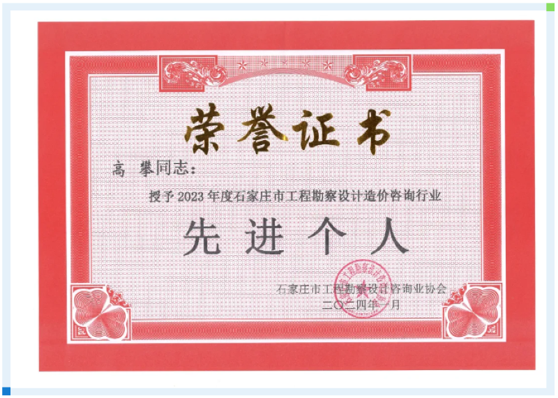 為表彰先進,弘揚奮發(fā)向上的進取精神,不斷提高勘察設計、造價咨詢行業(yè)管理水平和技術水平,推動全行業(yè)持續(xù)、健康、穩(wěn)定發(fā)展。石家莊市工程勘察設計咨詢業(yè)協(xié)會開展2023年度勘察設計造價咨詢行業(yè)先進單位及先進個人評選表彰活動。