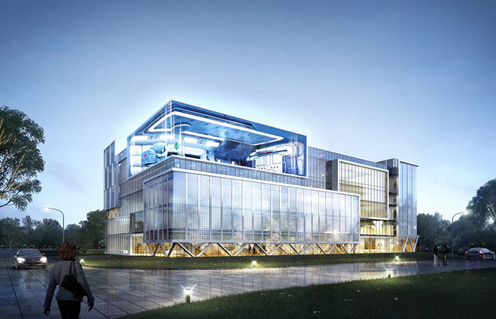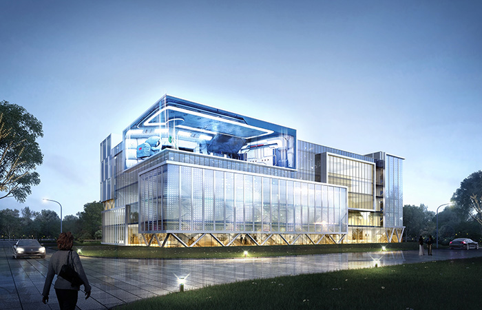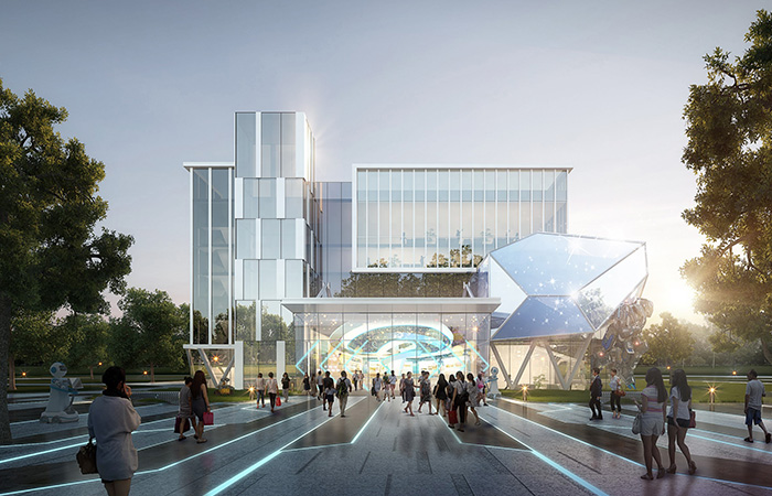 項目以科技“模方”,動感“魔石”,智能“膜屏”為設計理念, 采用模塊設計手法,將模方單元的組合形成虛實結合的建筑形態(tài),模方單元內白色龍骨陣列排序,打造時代科技框感;采用不規(guī)則形體設計手法,融入能量石的設計元素,設計中機器人背抗能量石,增加機器人與建筑的互動,打造機器人智能基地門戶標致;采用3D裸眼屏等高科技技術賦予建筑表皮,將科技與智能產品于室內室外進行多方位展示,打造出獨一無二的人工智能IP級視訊窗口。三種手法的運用,共創(chuàng)邯山門戶人工智能基地。