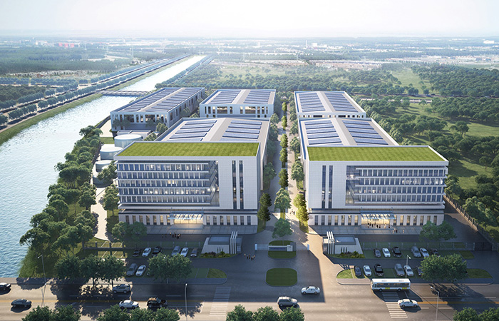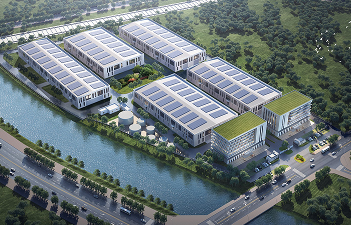 園區(qū)內(nèi)建筑主色調(diào)為白色。廠前區(qū)綜合樓采用框架結(jié)構(gòu),外立面采用米白色真石漆;生產(chǎn)廠房采用鋼結(jié)構(gòu),墻體主要為白色鋼板墻,局部有特殊工藝需求部位采用砌塊砌筑。整體塑造具有現(xiàn)代感的建筑形象。