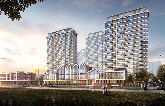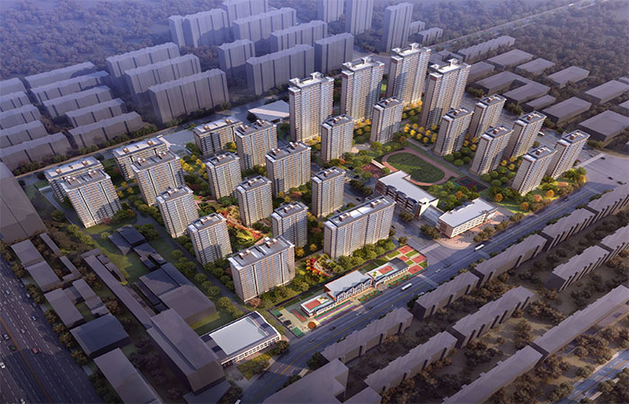規(guī)劃結(jié)構(gòu)上,利用道路將整體用地劃分為東西兩個組團,西側(cè)地塊較為規(guī)整,在地塊中間部分設(shè)置景觀中軸,將幼兒園設(shè)置在采光良好的南側(cè)。建筑立面采用白色與駝色相結(jié)合,打造簡約現(xiàn)代的建筑立面造型,通過對立面分割加強建筑橫向視覺感,運用精致簡約的線腳來體現(xiàn)建筑的典雅與華貴,彰顯建筑品質(zhì)。