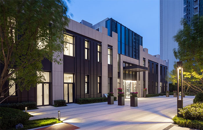 建筑立面整體風格以“典雅”的現(xiàn)代主義氣質(zhì)為主,為了保證鮮明的層次感,采用了米黃色石材、真石漆和淺灰色金屬、金屬漆四種材質(zhì),通過選材和構造設計,在極簡的基調(diào)中塑造動人的完整性。整體以框架結(jié)合簡潔的橫向線條的形式構成,整體效果簡潔典雅。