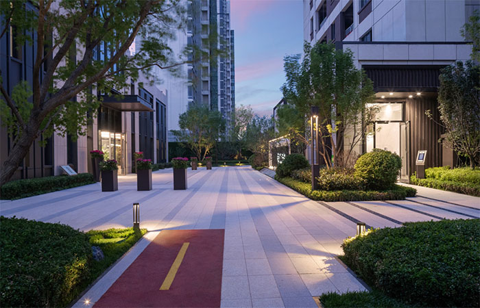 地塊形成南北向和東西向兩條景觀軸,南北主軸為本項目景觀設計重點部位,力爭打造“園中有筑,筑即為景”的建筑與景觀結(jié)合的典范中軸系統(tǒng)。地塊形成四個分區(qū)。序列性景觀節(jié)點,形成多重禮儀空間,傳承中國的空間禮序。通過中軸建筑的錯落式布局,形成多個半圍合式的居住組團空間。