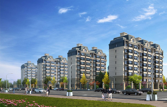 建筑造型采用西法風情建筑風格,墻體色彩以較為穩(wěn)重的褐色仿面磚真石漆,配以米黃色線腳。建筑底部處于近人范圍,建筑造型與細部強化處理,與優(yōu)美的庭院景觀相得益彰,共同營造溫馨浪漫的社區(qū)氛圍。建筑中段簡潔明快,韻律感強。建筑頂部通過造型變化,造型優(yōu)美精巧,形成小區(qū)標志性的建筑特色。