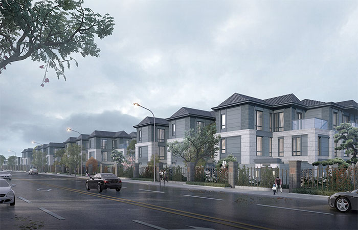 建筑風(fēng)格為新中式,立面顏色主要有灰色、深咖色、淺米色組成,設(shè)計(jì)優(yōu)雅大氣,富有格調(diào)。