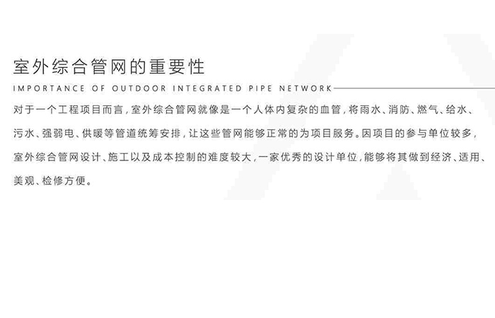 施工圖管綜設(shè)計:依據(jù)室外管線綜合方案圖及各專業(yè)的單體施工圖,繪制室外管線綜合平面圖,然后各專業(yè)按照管線綜合平面圖繼續(xù)深化相關(guān)圖紙。