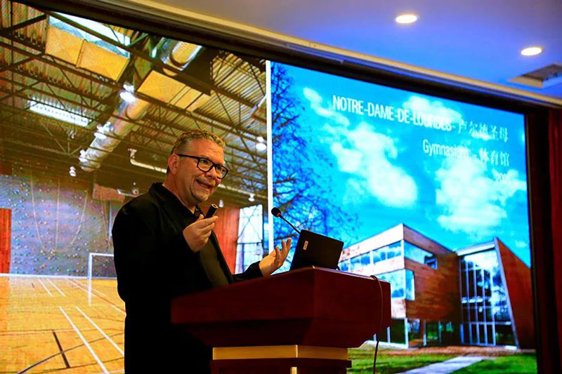 加拿大蒙特利爾Smith Vigeant建筑事務(wù)所首席建筑師Daniel Smith先生的出場將沙龍活動推向高潮,Smith先生從多角度介紹了加拿大現(xiàn)代木結(jié)構(gòu)建筑,例舉了Residential Development – 住宅區(qū) 、庫朱瓦克國家公園、Gymnasium - 體育館、Theater, 劇場等經(jīng)典建筑作品,并且向在座的設(shè)計師展示了國外優(yōu)秀設(shè)計作品。