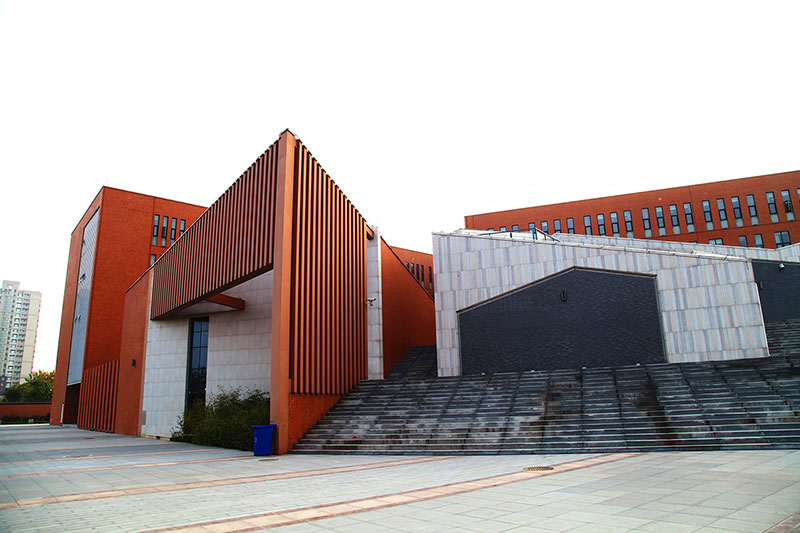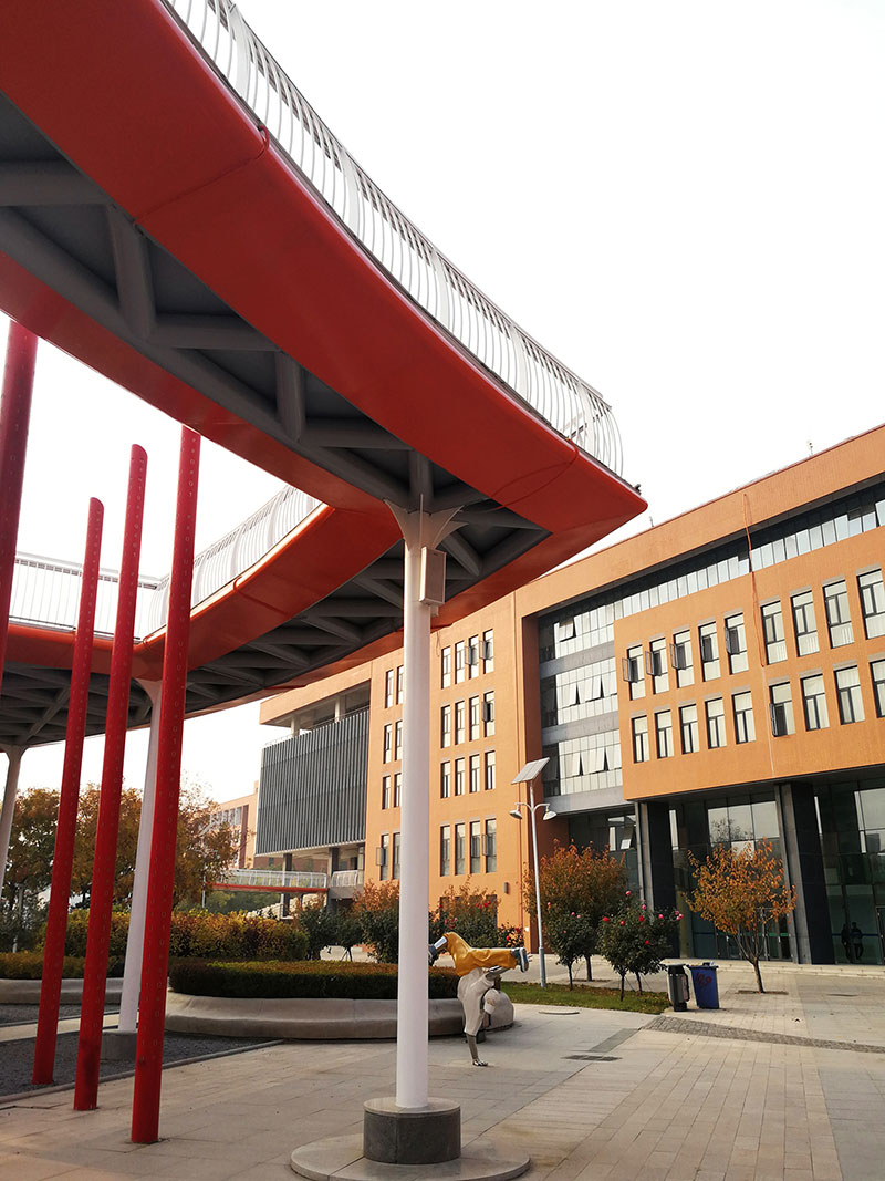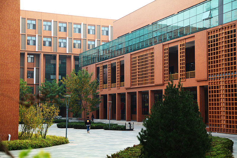 立面采用校園常用的紅磚手法,搭配鋼架及藍(lán)色玻璃幕,將傳統(tǒng)與現(xiàn)代相互結(jié)合,在給學(xué)生帶來濃厚傳統(tǒng)底蘊(yùn)的同時(shí)又不失現(xiàn)代創(chuàng)新的文化氣息。